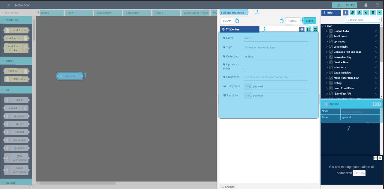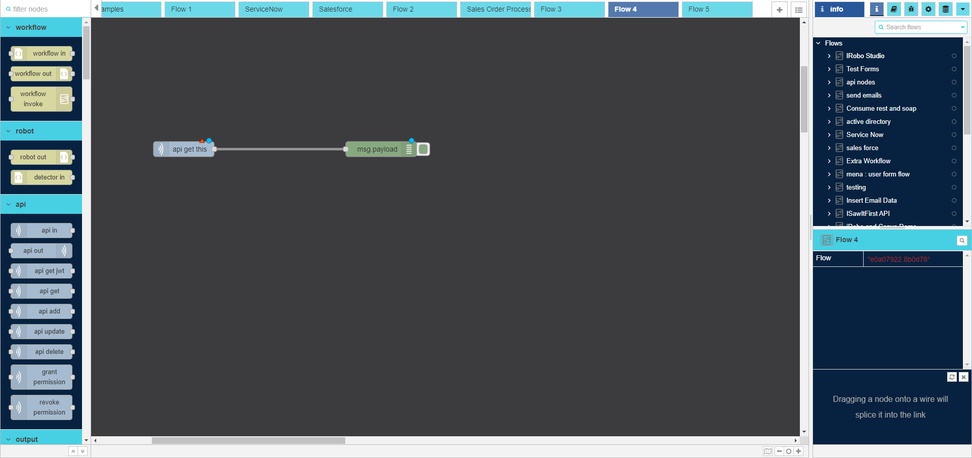 - Drag api out node to the Flow; complete the calling of api in node.