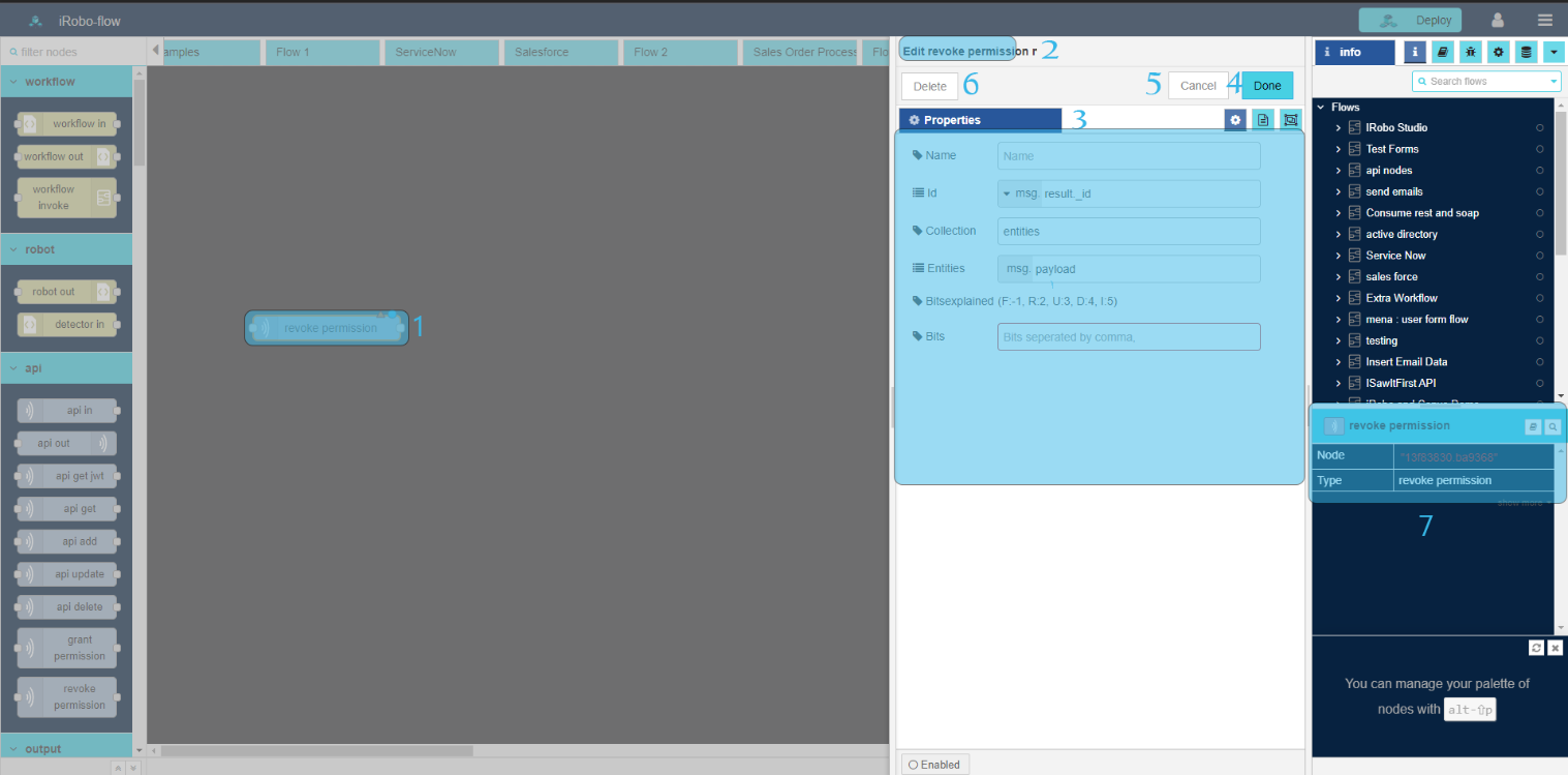 - Click Delete button: deletes node from the Flow.