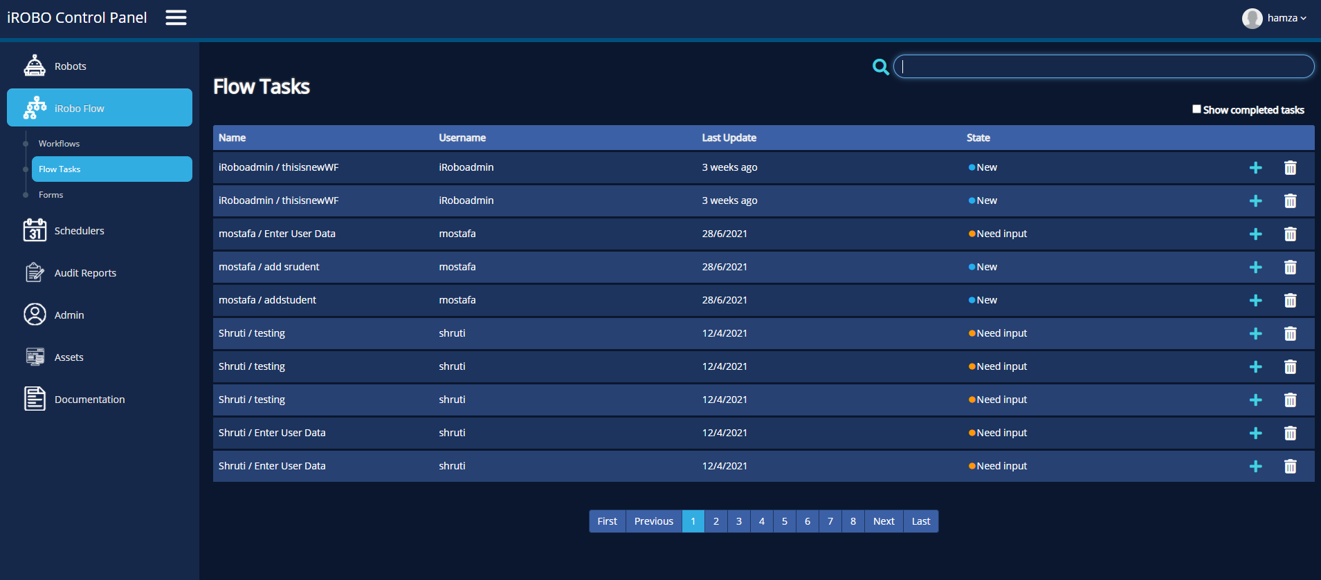 Flow Tasks list composes Flow Task name, Username, Last Updated ( date of last update occurred on Flow), State. |