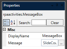 - Drag MessageBox Activity to the Sequence, and then assign SlideCount variable value to Message field in Properties Panel.