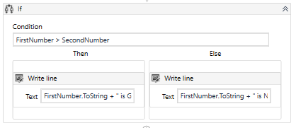 - For Then Condition, type Number1.ToString + "is greater than" + Number2.ToString.