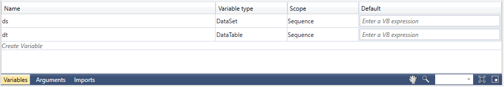 - Create DataSet, DataTable Variables into Variable Table as shown in the image below.