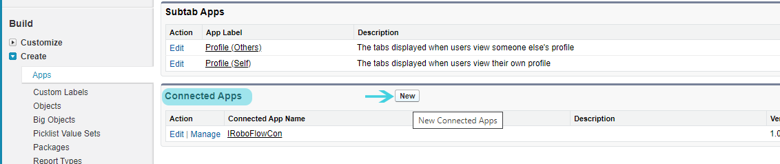 - Apps page appears, scroll down to end of the page. You'll find Connected Apps Tab, click New to create a new Connected APP.