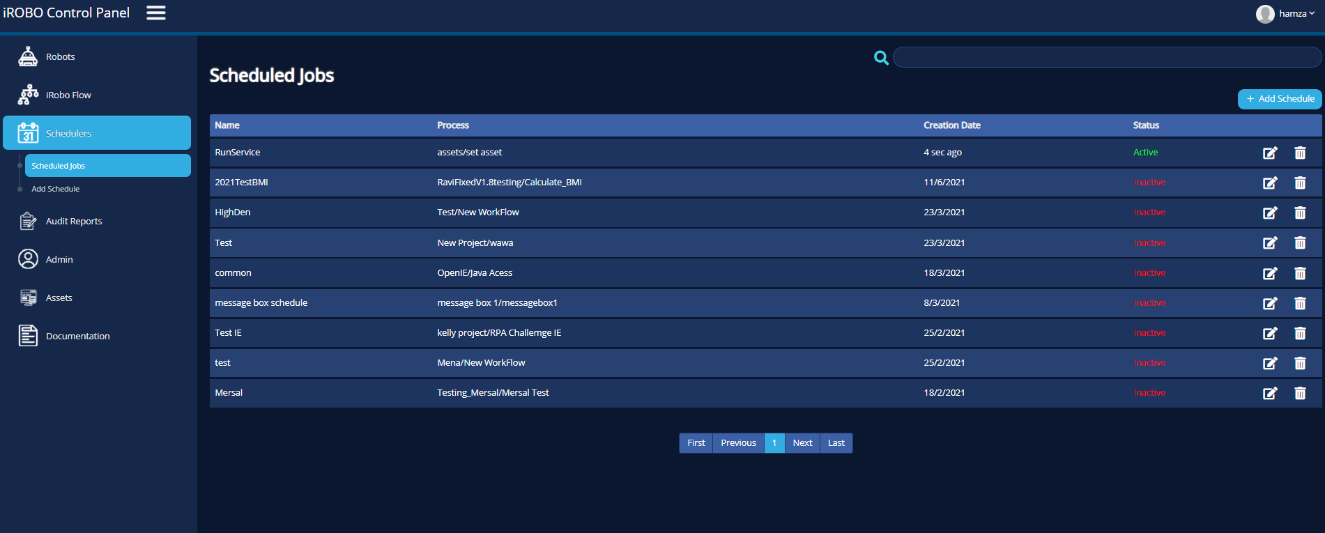 Status is either; Active or Deactive. If it is Active, the Workflow in the scheduled job is running on the selected Robot. If it is Deactive, the schedule is saved but not running. |