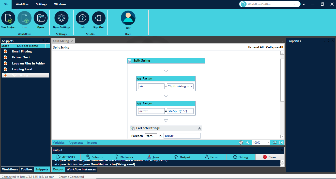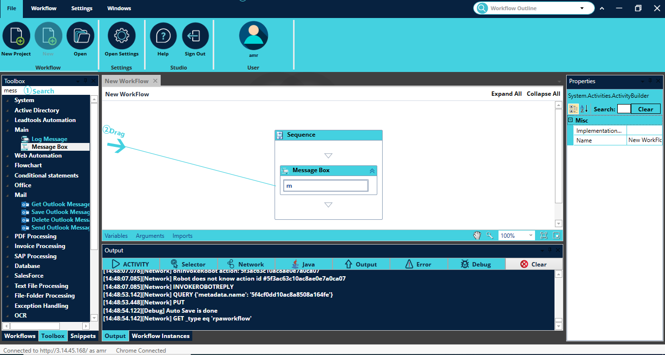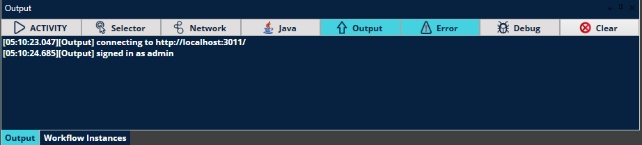 Play button: to run the automated process of the debugged activities in the Workflow which appears in the Output Panel as shown in the image below.