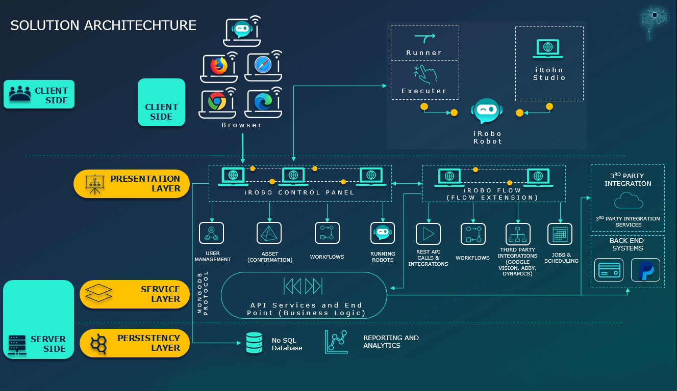 Browser: runs iRobo Workflows using iRobo Control Panel in a Web Browser.